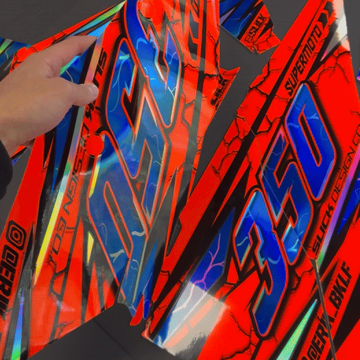 This is our most premium handmade kit, where two stunning materials are combined for an extraordinary effect. The vibrant Fluo Orange makes your graphics pop with an intense, eye-catching glow, while the Holochrome adds an extra dimension, giving your design a dynamic, reflective finish that changes with the light. Together, they create a one-of-a-kind look that is sure to stand out!